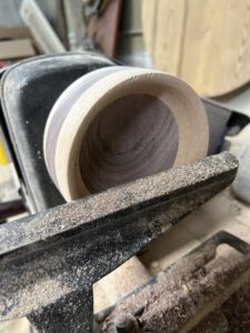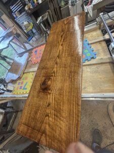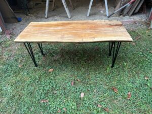 The final phase of finishing a coffee table that is 3″ thick with 4×4 wooden legs.